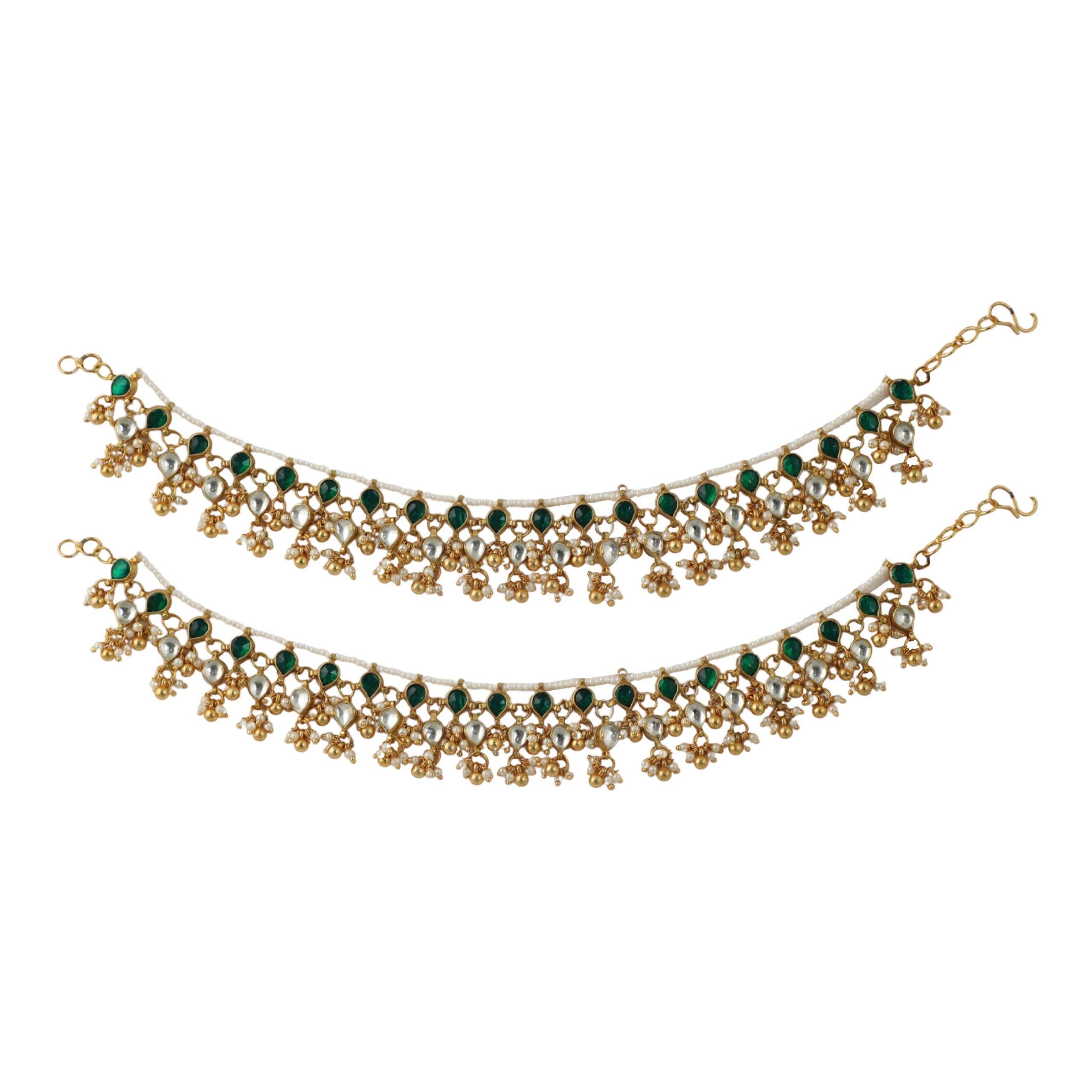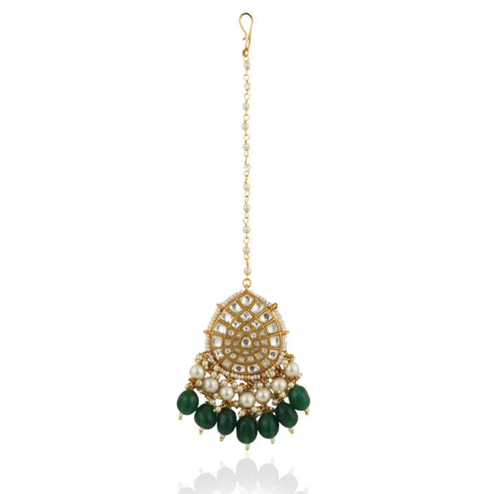 Heavy Maangtikka Studded With Jadtar Stones And Green Drops
