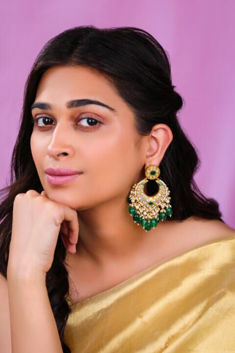 Artisan earings in jadau with emerald stone and beads