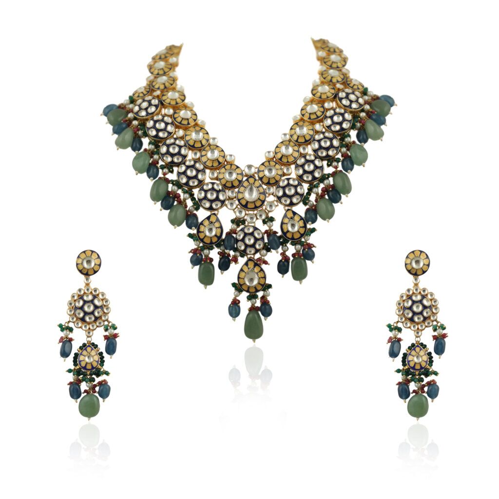 Blue Meena Work Long Necklace Set With Blue And Sea Green Beads