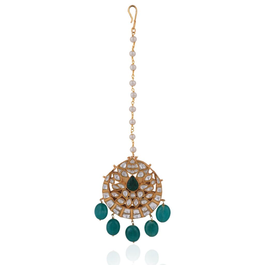 Emerald Green Beads White Jadtar Wedding Wear Maangtikka