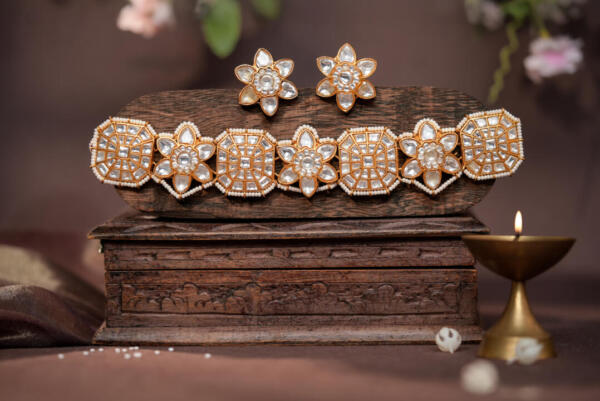 Floral design white choker with studs