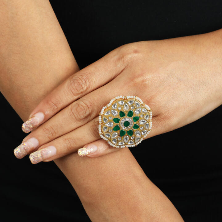 Floral Traditional Ring Studded With Green And White Stones