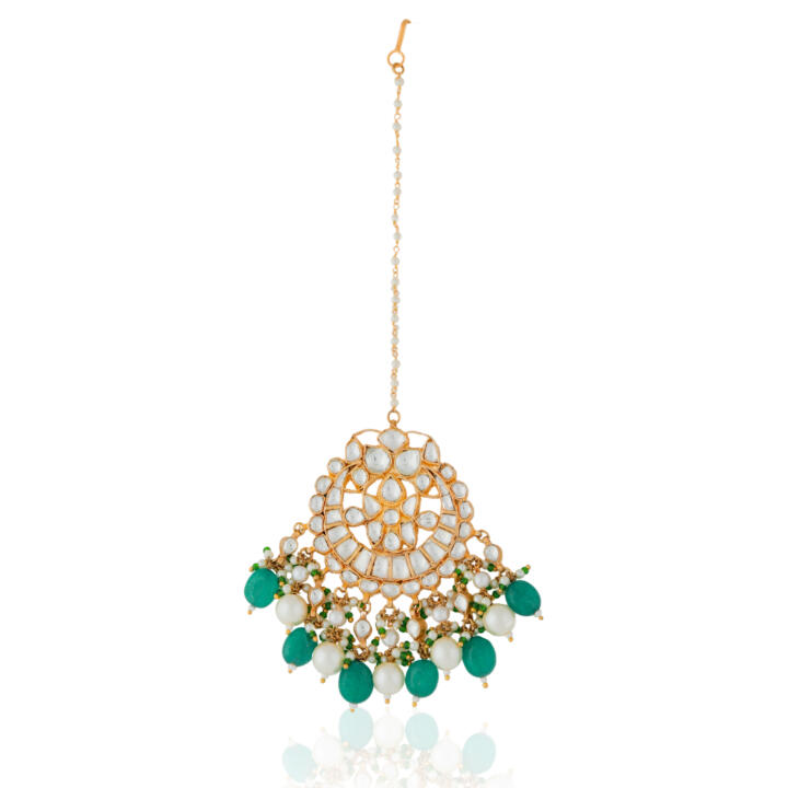 Gold finish jadtar green white Maang Tikka