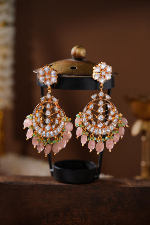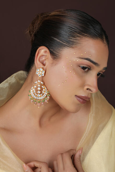 Gold-Plated Floral Kundan & Pearls Studded Drop Earrings