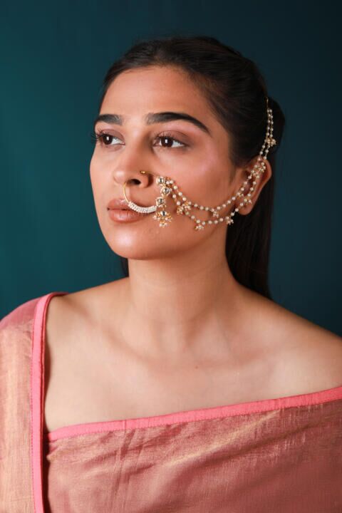 Gold plated traditional and jadau nath,nathni with multilayer pearl chain for woemn