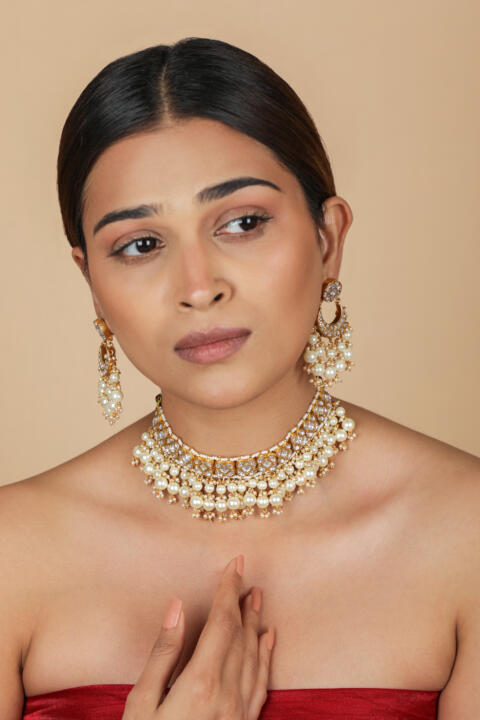 Gold plated white pearl choker set with 3 layer beads