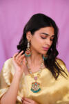 Jadau long pendant necklace with ruby stones and sea green pastel beads