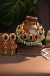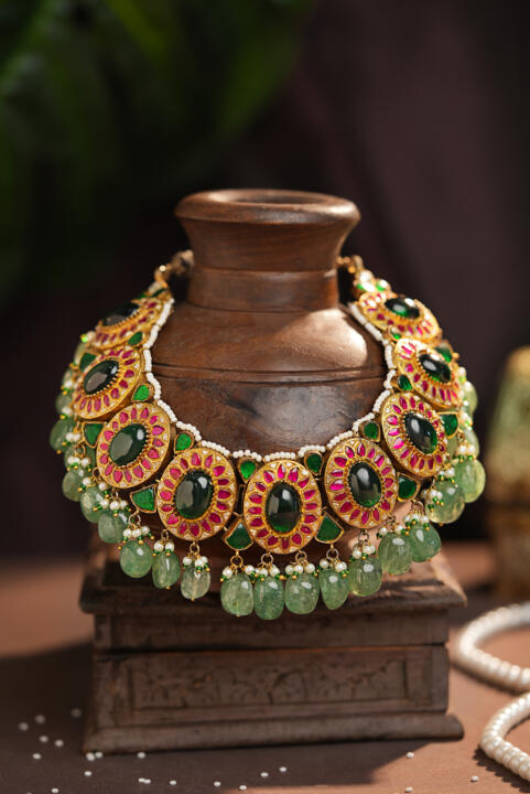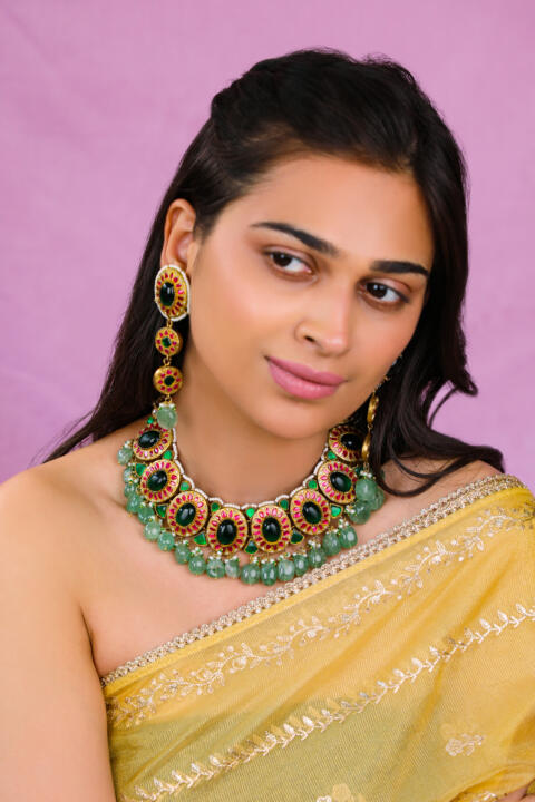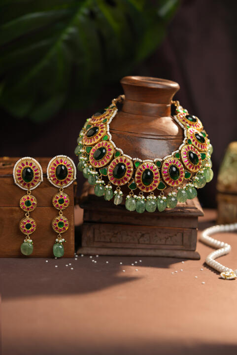 Mozonite necklace set with big emerald stone drops and jade hangings
