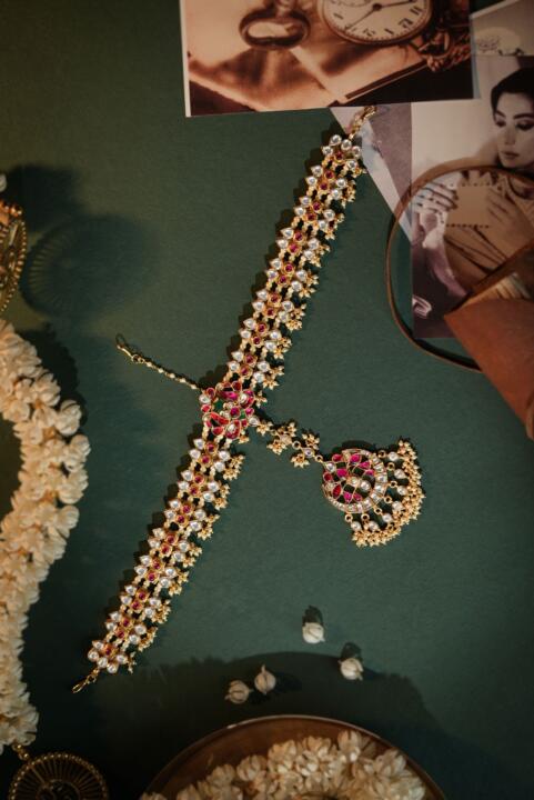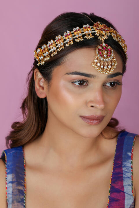 Peacock design pink & Green gold plated Mathapatti