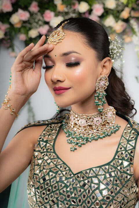 Pink Meenakari Necklace With Green Hangings Wedding Wear Necklace Set
