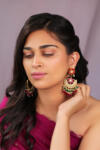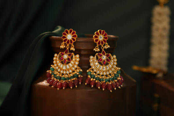 silver chandbali drop earings with ruby beads in floral design