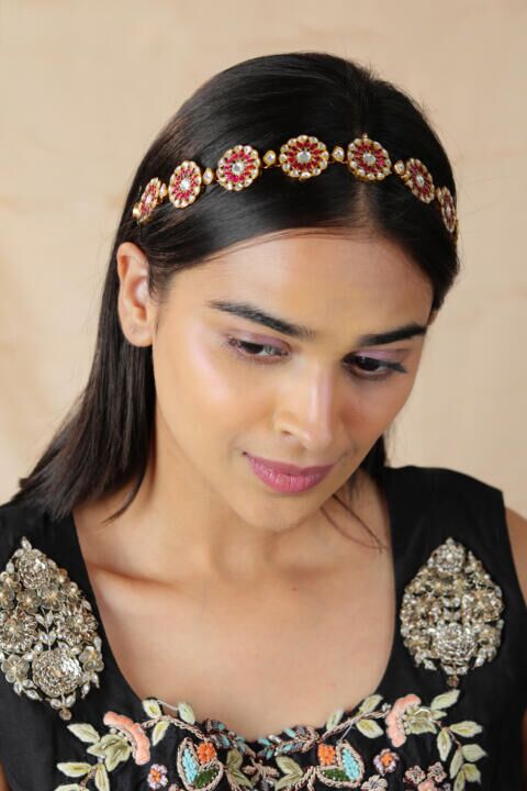 South style temple kundan mathapatt/hairbandi in floral design with Ruby and jadau stones