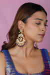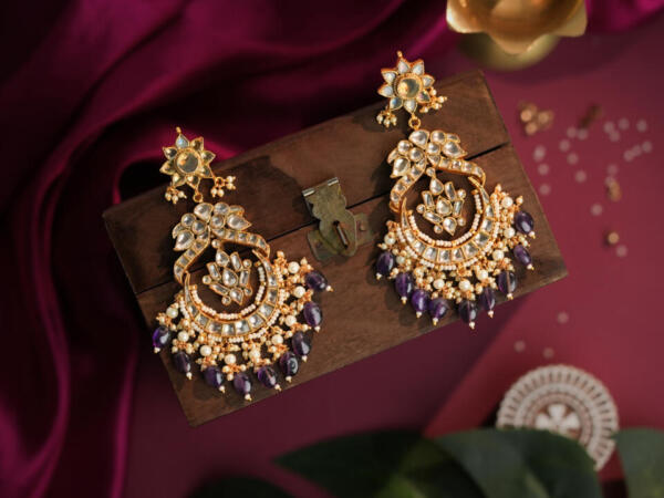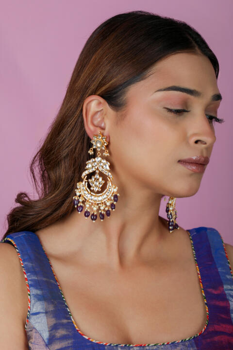 traditional Indian gold-plated Chaandbali earrings featuring intricate Jadau Kundan work, pearls, and green and purple gemstone beads