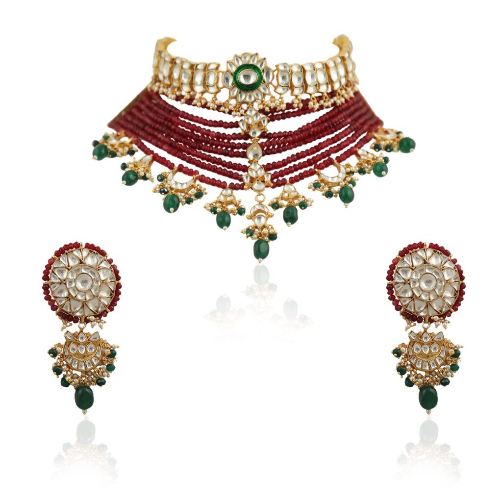 White Choker Set Attached In 8 Line Red Beads With Green Hanging
