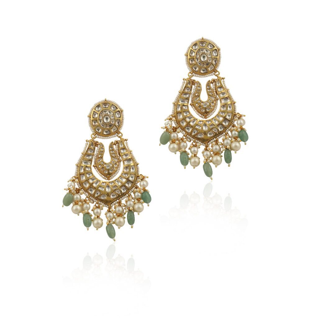White Jadtar Stone Big Earrings Beadded White Pearls And Sea Green Beads
