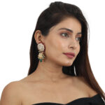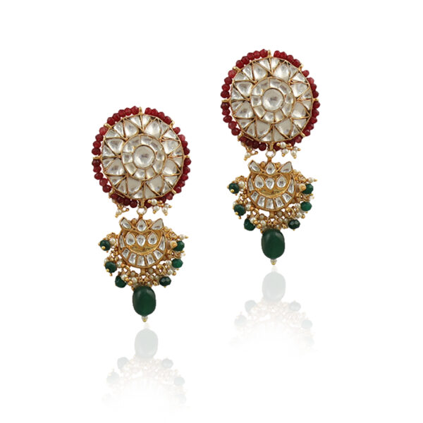 White Jadtar Stone Earrings With Red Moti Work With Green Beads